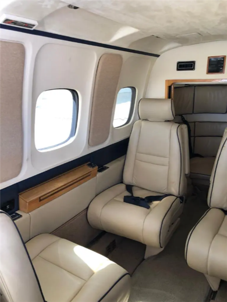 7 Passenger Executive Leather Seating, Carpet and Custom Cabin Accents. Wood Cabinets and Dual Executive Writing Tables. |